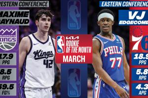 体育资讯04月03日讯 今天NBA官方公布了3月份月最佳新秀,西部国王42号秀雷诺和东部76人探花秀埃奇库姆当选。