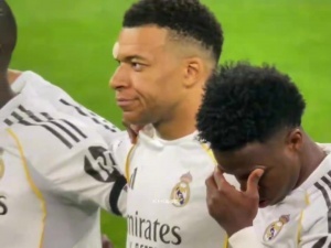 体育资讯04月16日讯 欧冠1/4决赛拜仁vs皇马赛前,两队为致敬离世的皇马旧将、1982年世界杯西班牙国家队主帅何塞・埃米利奥・桑塔马里亚举行默哀仪式。现场有部分德国球迷响起阵阵喧哗,姆巴佩摇头表示不满。